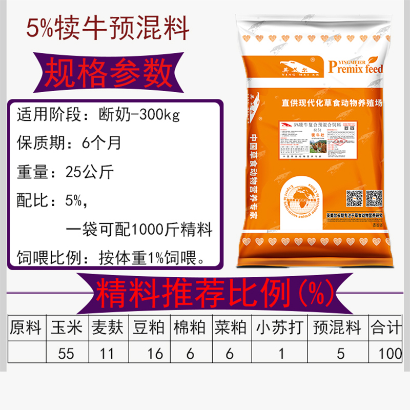 牛预混料是配制牛饲料的核心成分,对牛的生长起着预防疾病、促进牛快速催肥、提高饲料报酬的作用。 那么牛预混料如何配制能达到快速催肥的效果呢?肉牛在快速生长期,对各种营养养物质的需要**正常需求。在以玉米豆粕为基础饲料的肉牛精料配制上,各种微量元素、维生素及氨基酸的合理添加,有利于促进肉牛对饲料的消化利用,促进蛋白质的合成,使肉牛快速催肥。 玉米豆粕型牛精料所需要补充的微量元素主要有铜、铁、锌、锰、钴,配制一吨牛精料添加五水硫酸铜40克,一水硫酸亚铁160克,一水硫酸锌90克,一水硫酸锰100克,氯化钴0.6克,碘酸钙0.7克,即可满足肉牛快速育肥对各种微量元素的需要。肉牛自身所合成的B族维生素一般可满足其需求,因此肉牛料中所需添加的维生素主要是脂溶性维生素。牛饲料中钙、磷的补充主要以磷酸氢钙的形式添加,配制一吨牛精料要添加磷酸氢钙10公斤。小苏打和氧化镁配合使用是很好的缓冲剂,可使牛瘤胃的酸碱度保持平衡,提高饲料利用率,有效预防中毒,在牛饲料中的添加比例分别是1%,0.5%。 在配制牛精料的过程中,为保证混合的均匀度,要注意微量成分应分别添加,各种微量元素及维生素应分别进行预混合后,才可用于配制牛预混料。 集约化圈养肉牛催肥饲料配方包括精料饲料配方和粗饲料配方以及根据体重和生产目标所的原料饲料和饲料添加剂配比。以下是不同体重的育肥牛催肥饲料配方。